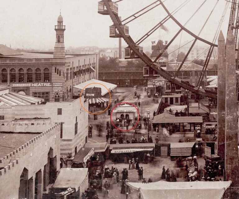 Competing orange cider booths near the Ferris Wheel in a photograph by C. E. Waterman, 1893. CHM, ICHi-002440.