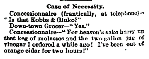 “There is a general complaint concerning the quality of the stuff now sold in the Exposition grounds as ‘orange cider.’ It was delicious when first introduced and became very popular, but prosperity seems to have spoiled it. Until the manufacturers return to first principles and make it of orange juice instead of vinegar, molasses, and various slops the Worlds’ Fair visitor will do well to let it alone.” (September 13, 1893, p. 12).