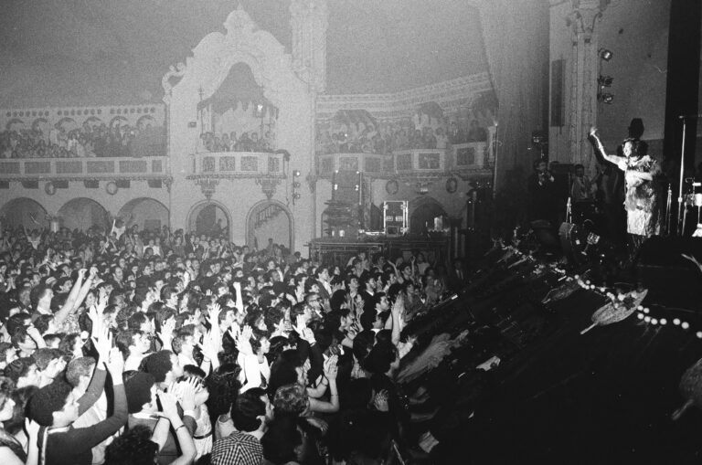 Celia Cruz performing at the Aragon Ballroom, 1106 West Lawrence Avenue, Chicago, in 1982. La Confidencia was her backing band that night with Angel Meléndez on trombone. ST-30002632-0012, Chicago Sun-Times collection, CHM