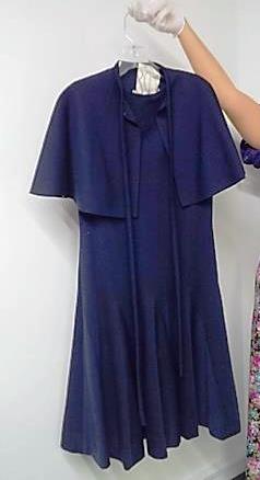 The most compelling discovery came when we looked through the Pauline Trigère newspaper archives folder. Inside, we found a Chicago Tribune article dated March 4, 1963, showing a model wearing a Trigère “tailored town costume” with “caplet and flares” that “accent your natural curves.” Given that the Parsons’s dress did not have a physical Trigère label on it (though we were assured it was an original), the next best way to date it was by comparing it to her other designs from which we were able to estimate its date to the early 1960s. It was extremely validating to find such a specific source of evidence and once again prove the benefits of combining paper and costume archives in order to tell the stories held by garments.