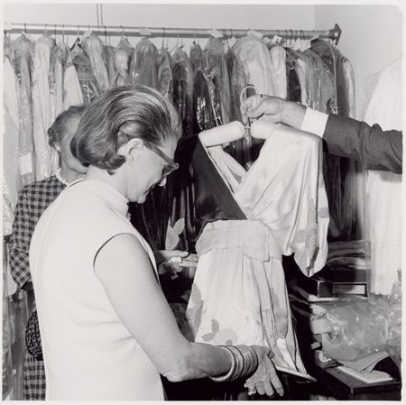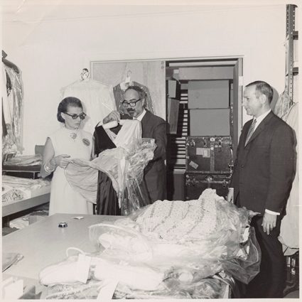 Trigère handles Paul Poiret’s “Sorbet” dress as it is taken out of storage. CHM, ICHi-075779