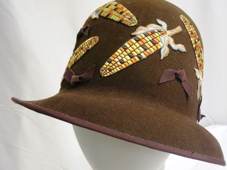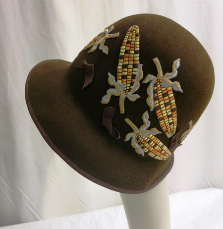 Mrs. Samuel Liebman (née Doris Valerie Frazin), a devoted patron of the Bes-Ben millinery shop, donated this cloche-style hat to the Museum in 1988. It sits low on the head and is covered in corn appliqués and brown bows. Benjamin Green-Field, the owner of Bes-Ben, referred to Mrs. Liebman as the “Hat Lady” because she loved hats and wore them well; some of her hats were made especially for her by Bes-Ben.
