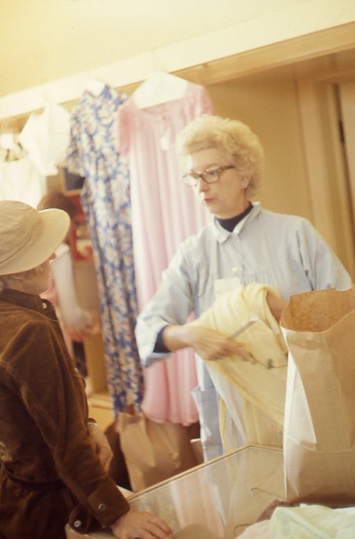 A woman wraps up a package for a customer at a rummage sale at Kenilworth Union Church, Kenilworth, Illinois, c. 1974. A variety of nightgowns hang in the background. CHM, ICHi-181333 / © The Estate of Vivian Maier