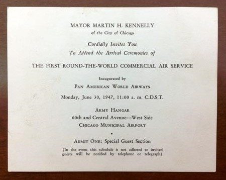 In early 1947, Juan Trippe, president of Pan American World Airways, began lobbying Congress to form an exclusive, unified airline known as Community Company for international travel with his company at the core. Opponents claimed this would create a monopoly and defeated the measure. Undaunted, Trippe continued to advocate his cause with influential friends and associates. He arranged an around-the-world press flight for leading newspaper publishers from across the country, including Marshall Field III of the Chicago Sun and J. L. Maloney of the Chicago Tribune. Also on board was a small Chicago flag, brought by Trippe himself to help promote Chicago’s prominent place in the future of aviation.