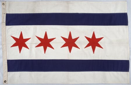 April 4, 2017 marks the 100th anniversary of the Chicago flag, one of the city’s most familiar symbols. To mark the occasion, CHM is hosting a special event that evening, featuring two flags from the Museum’s collection. The first is from 1920 and has two red stars, as originally designed by Wallace Rice to represent the Great Chicago Fire of 1871 and the 1893 World’s Columbian Exposition. The second has two additional stars that were added in the 1930s to signify Fort Dearborn and the 1933–34 A Century of Progress International Exposition. This flag looks more familiar, but it has a surprising story to tell.