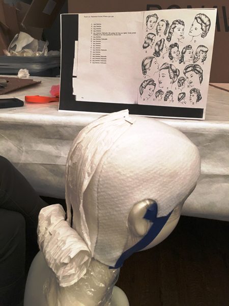 An example of how paper wigs and ribbon shoes can fill in a mannequin’s blank presence. Behind-the-scenes photographs taken by CHM staff