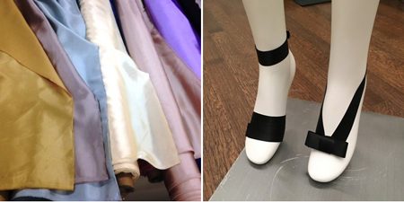 Once we selected the materials and designs, the final step was mounting them on the mannequins. Dressing a garment for exhibition can take many hours depending on the needs of the object. Mannequins are often padded with a soft, stable material such as cotton to help them support the often-fragile garments. The prop dresses were sewn and mounted on the mannequins before the artifacts could be placed over them. All of the ribbon shoes and wigs were applied after the object was mounted onto the mannequins, so as to avoid causing stress to the garment. Working with mannequins has both benefits and challenges. Fitting a dress for a mannequin is much easier than on a human, since they don’t move or change size, but mounting ribbon shoes after the garment was in place meant there was a bit of kneeling and lying on the floor in order to manipulate and secure the ribbon. The end result, however, was worth the effort.
