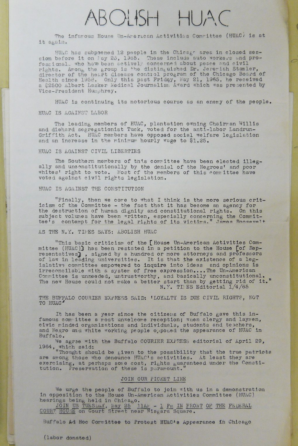The collection provides decades’ worth of documentation thanks to the work of its two executive directors, Richard Criley and Rachel Rosen DeGolia. The CCDBR was formed in 1960 from the Illinois branch of the Civil Rights Congress and several other smaller organizations that focused on opposing the House of Un-American Activities Committee (HUAC). The CCDBR soon partnered with the National Committee Against Repressive Legislation (NCARL) to promote the abolishment of HUAC.