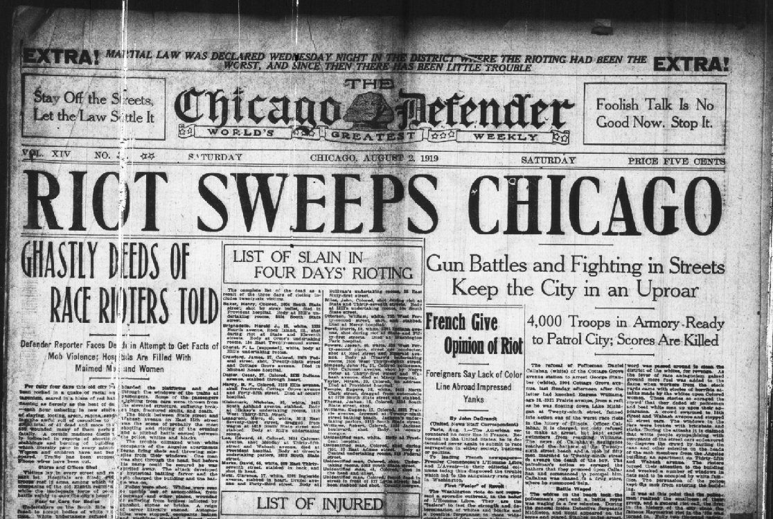 The front page of the Chicago Defender on August 2, 1919, announced the turmoil in the city and listed the names of those who were slain and injured. CHM, ICHi-040222