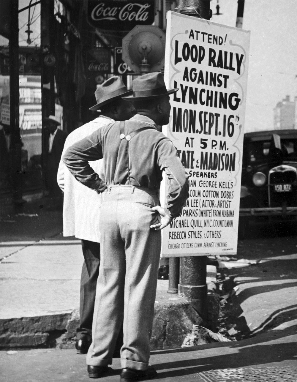 The aftermath of World War II saw a revival of white attacks on African Americans. Here, two men at 31st Street and Cottage Grove Avenue stand next to a sign for a rally against lynching, August 1946. CHM, ICHi-003616; photograph by John F. Weld