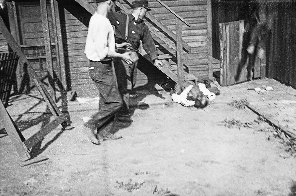 Two white men stone an African American man during the riot. White gangs intentionally went into black neighborhoods to wreak havoc. CHM, ICHi-022430; photograph by Jun Fujita