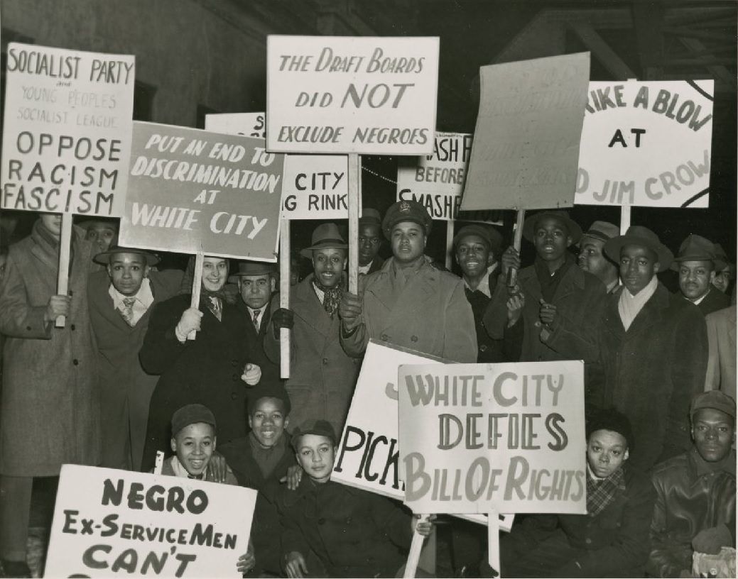 Protests throughout the 1940s and 1950s sought to break down racial barriers in housing, public accommodations, and recreational activities. This one took place at the White City Roller Rink, 63rd Street and South Parkway (renamed Martin Luther King Drive in 1968), Chicago, 1946. CHM, ICHi-019601; photograph by John F. Weld