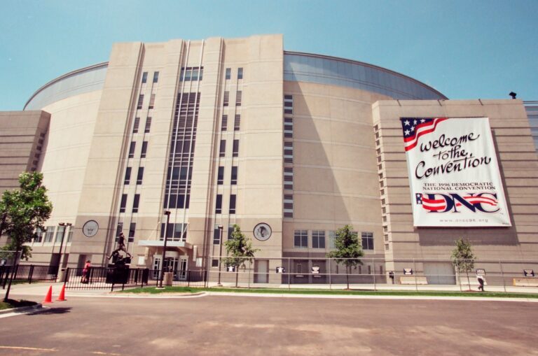 Exterior view of the United Center during preparations for the 1996 DNC, June 25, 1996, Chicago; ST-30002442-0080, Chicago Sun-Times collection, CHM. Democrats took great care to soothe concerns that this convention would become the chaotic 1968 DNC and played up inter- and intra-party unity. President William J. Clinton was renominated and would go on to win another term in office.