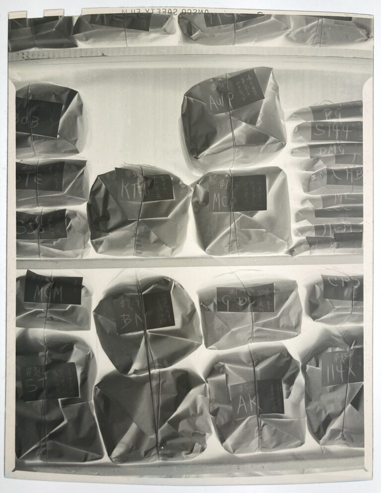 Negative showing packet packets of laundry at a Chinese laundry, Chicago, April 5, 1948; Lyle Mayer, photographer. Lyle Mayer Photograph Collection, CHM, Box 2, Unit #46, S4364. Call Number 1986.0207.