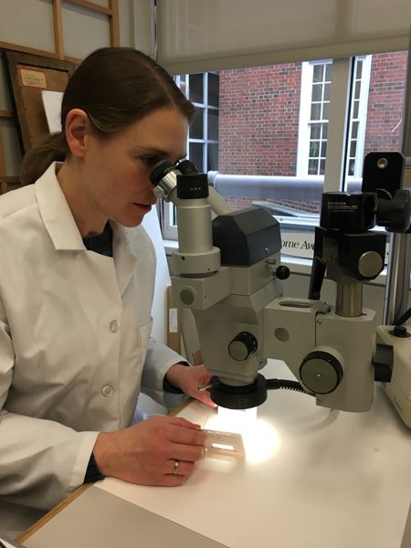 Britta examines a blunder trap under the microscope in the conservation lab.