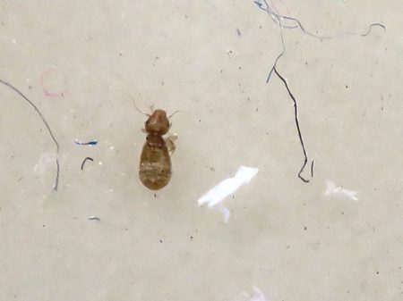 An adult booklouse inside a blunder trap. These tiny insects enjoy eating microscopic mold found inside books where there has been a previous humidity issue.