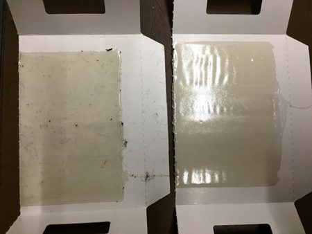 Inside two blunder traps: left, a collected trap with evidence of pest activity, and right, a fresh trap to replace the old one.