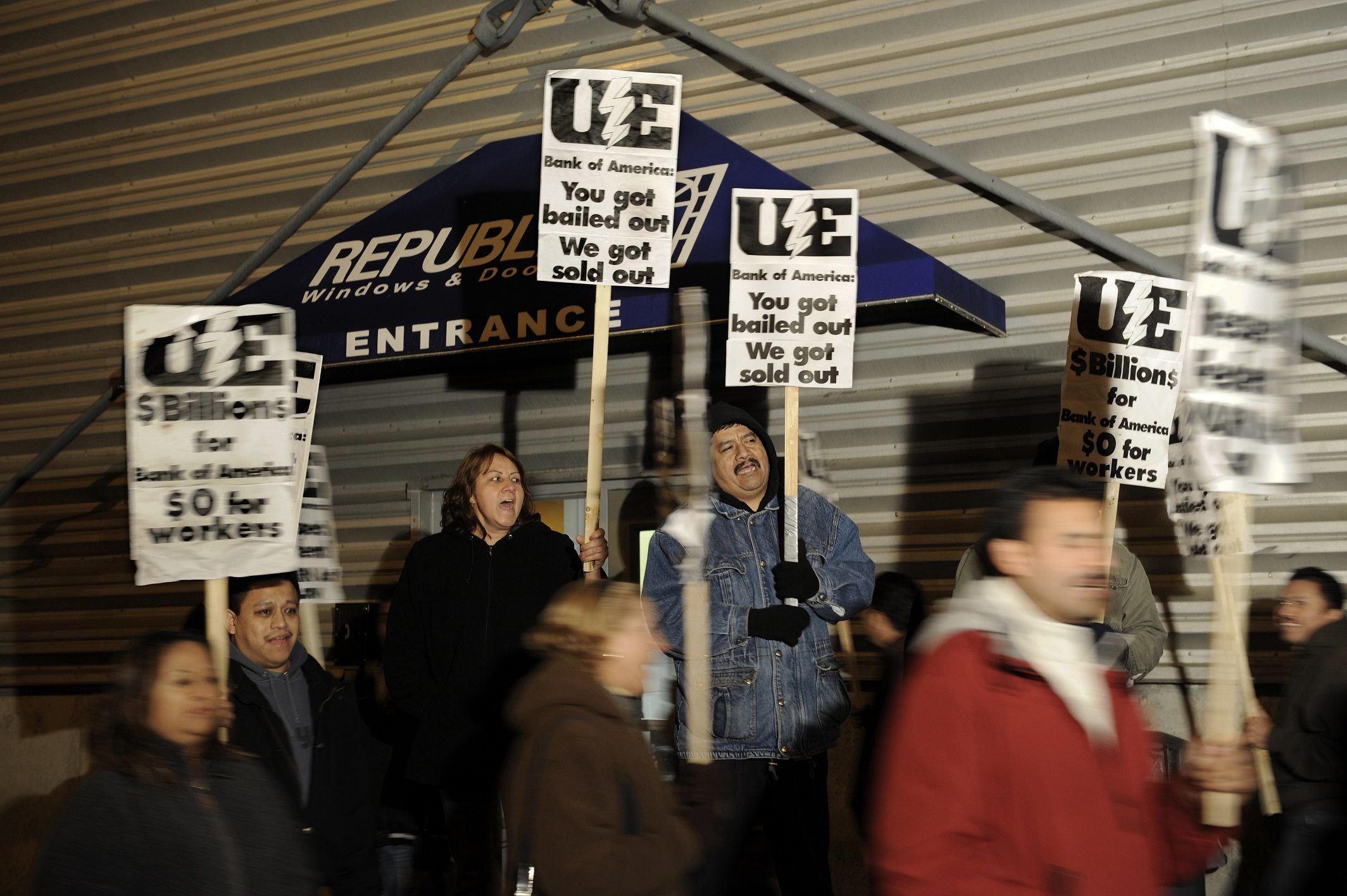 Walkout at Republic Windows and Doors in Goose Island, as former employees picket the entrance due to not getting pension, vacation pay, and extended health care after the company closed without proper notification, December 8, 2008. STM-011368057, Tom Cruze/Chicago Sun-Times