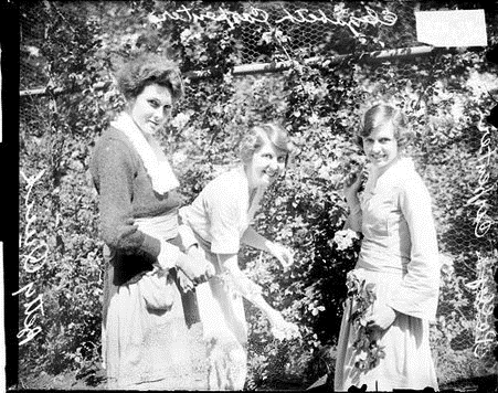 Miss Betty Quick, Miss Elizabeth Carpenter, and Miss Polly Carpenter standing outside near a fence covered in plants, picking flowers, in Chicago, 1920. The Carpenters on the right have bobbed haircuts whereas Quick on the left has her hair in an updo. DN-0072316, Chicago Daily News collection, CHM