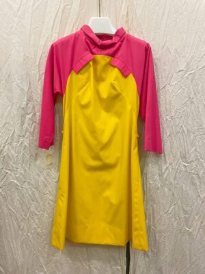 “The Puccino” was meant to be worn as an apron and was released in a variety of bright colors. Pucci’s accessories were just as bold, including, most notably, the “bubble helmet,” designed to protect flight attendants from the rain. Its aesthetic was inspired by the retro-futuristic look of mid-60s airline travel.