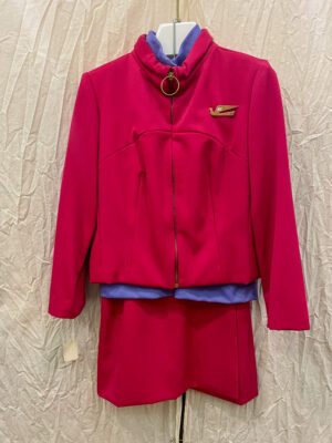 In 1965 Pucci released the “AirStrip,” also called the “Gemini IV.” Each piece was interchangeable and layerable. Pucci was able to create chic but comfortable uniforms that adapted to the working conditions of the flight attendants. The bold pink skirt and suit could be worn over the purple turtleneck blouse and culottes, while the lime green coat was functional for weather changes while flying.