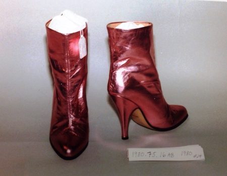 Women’s boots, 1980, Fiorucci; metallic leather, 4.5 in stiletto heels. Gift of Paul B Presents (1980.75.16ab).
