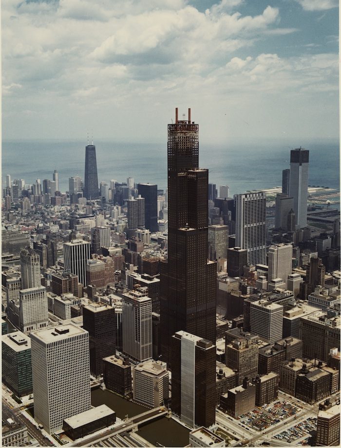 The Sears Tower under construction, Chicago, c. 1972. In the left background is the John Hancock Center. HB-36150-H2, CHM, Hedrich-Blessing Collection.