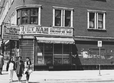 Women walking in front of Vietnam-American Tailor storefront at 1038 W. Argyle St., Chicago, 1987. CHM, ICHi-040734