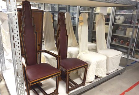 The answers to these questions are complex and vary with each institution, but here at the Chicago History Museum, we have a dedicated team of collections professionals who work tirelessly to preserve the physical and intellectual integrity of the artifacts both on exhibit and in our storage facilities. Museums don’t have the space or resources to display every single artifact, so managing storage facilities is imperative to preserving collections. CHM is fortunate to be able to store a variety of artifacts—such as costumes, paintings, and decorative and industrial arts—on-site as well as at two off-site locations.