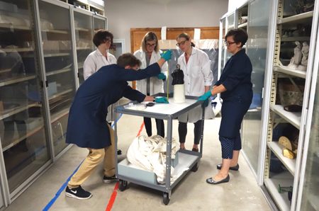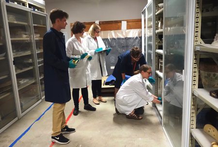 L to R: Intern Ryan Meara takes artifact dimensions while interns Elise Cabral and Jessica Cunny record information. Arendt and Washington observe and offer advice.
