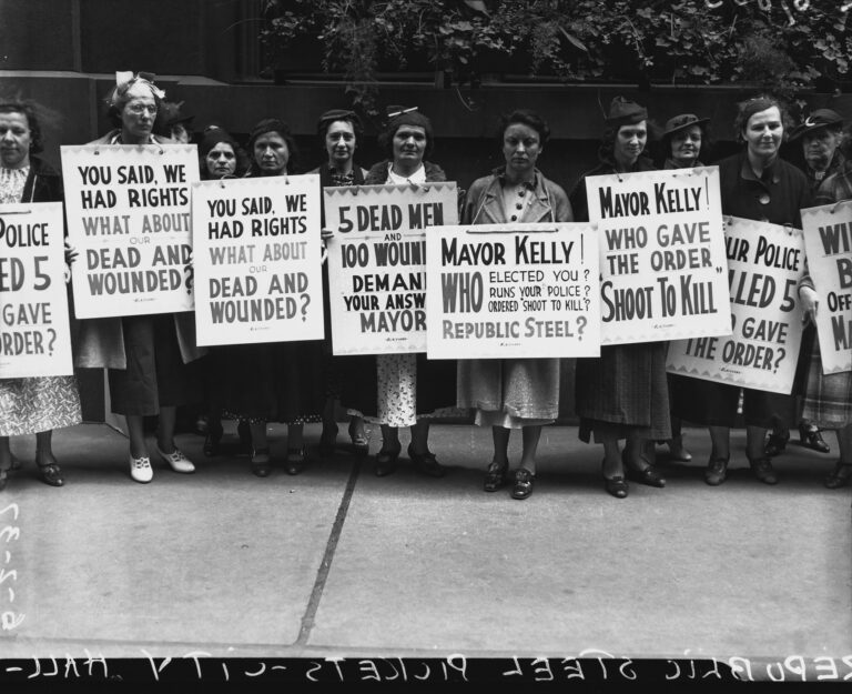 Women protesters picketing at City Hall in support of Republic Steel strikers after what is known as the Memorial Day Massacre, Chicago, June 2, 1937. DN-C-8805, Chicago Sun-Times/Chicago Daily News collection, CHM