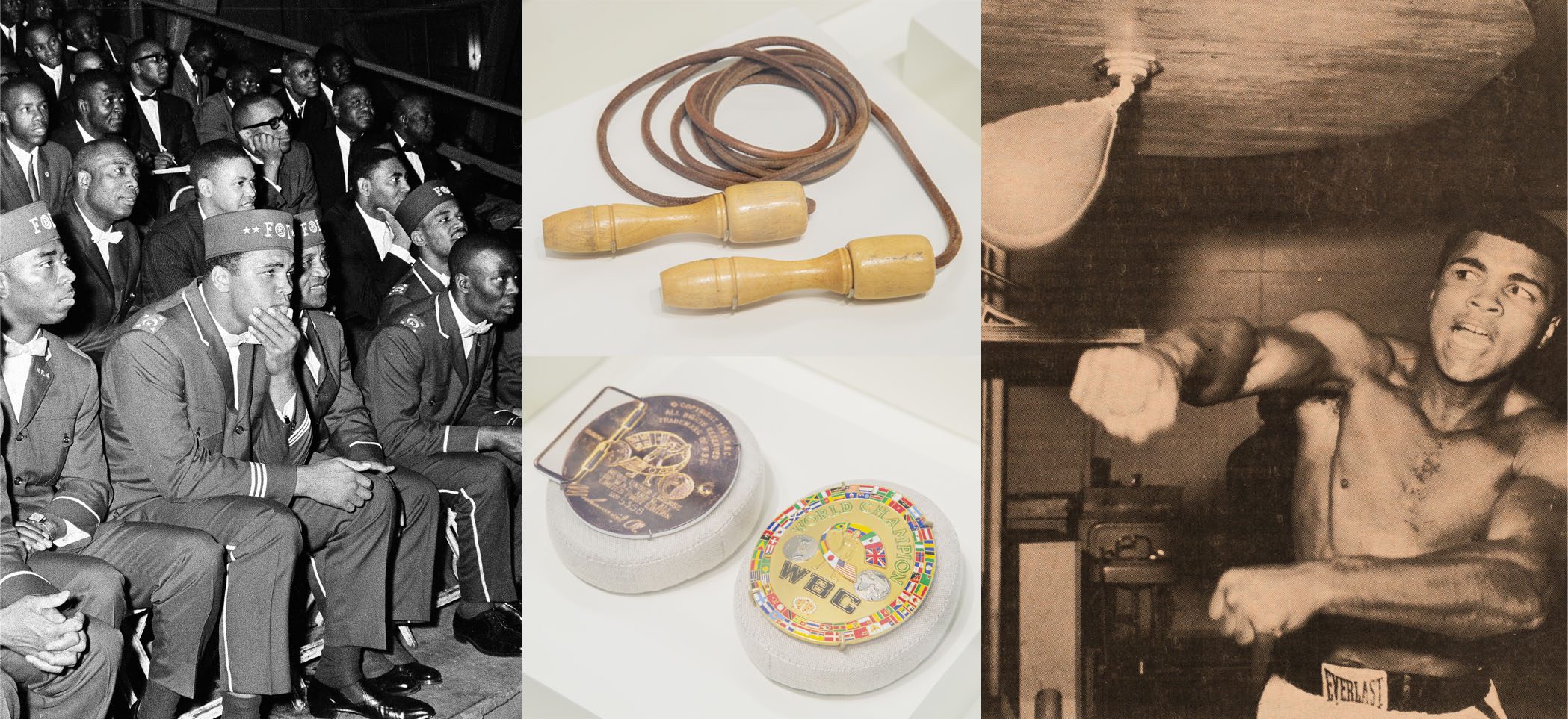 From left: Muhammad Ali (hand on chin) wears a Fruit of Islam uniform as he listens to the leader of the Nation of Islam, Elijah Muhammad, speak to a crowd at the Saviours’ Day event in the Coliseum at 15th St. and Wabash Ave., Chicago, February 27, 1966. ST-19031786-0007, Chicago Sun-Times collection, CHM. Jump rope with autographed handle, United States, c. 1970. Commemorative World Boxing Council belt buckle, 1985. Both items courtesy of Sultan Rahman Muhammad. Muhammad Ali training in Chicago, published on page 9 of Muhammad Speaks, November 10, 1967. CHM, ICHi-177193A.