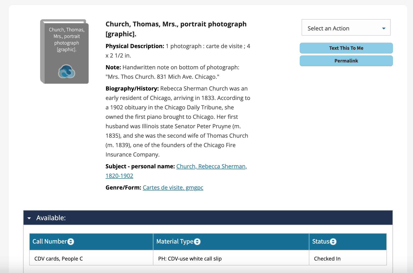 Carte de visite of Mrs. Thomas Church (see bib# 31924). Thanks to Mayfield’s research, the catalog record for this photograph is now updated with a transcription of the handwritten note, a heading that reflects Mrs. Church’s full name (“Church, Rebecca Sherman, 1820–1902”), and additional biographical information.