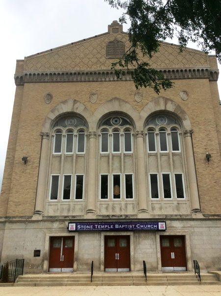 Stone Temple Baptist Church, 2017. The Ten Commandments in Hebrew at the apex of the roof speak to the church’s origins as the First Romanian Congregation Synagogue. Photograph by Peter T. Alter