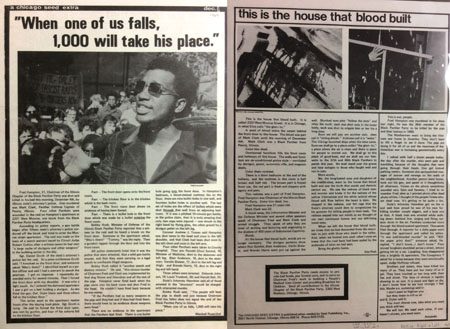 Front and back of a Chicago Seed Extra poster (1969), which explains how Fred Hampton and Mark Clark, at 21 and 22, respectively, and leaders of the Illinois chapter of the Black Panther Party, were killed by law enforcement at 2337 West Monroe Street.