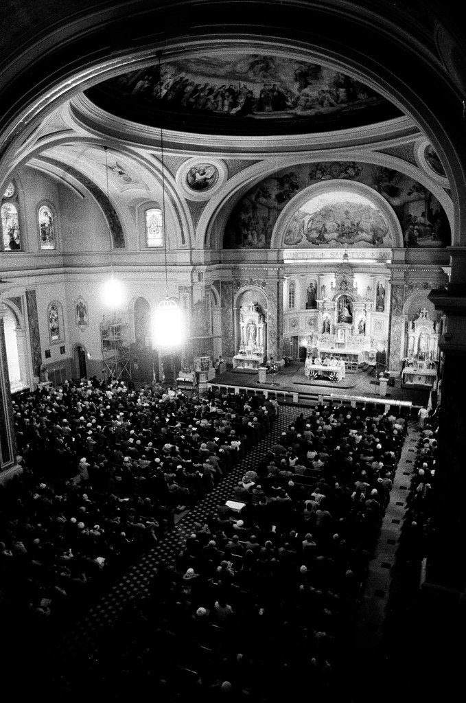 Overhead view of parishioners celebrating a mass at St. Hyacinth Basilica, Chicago, December 11, 1983. ST-19041501-0006, Chicago Sun-Times collection, CHM