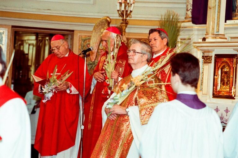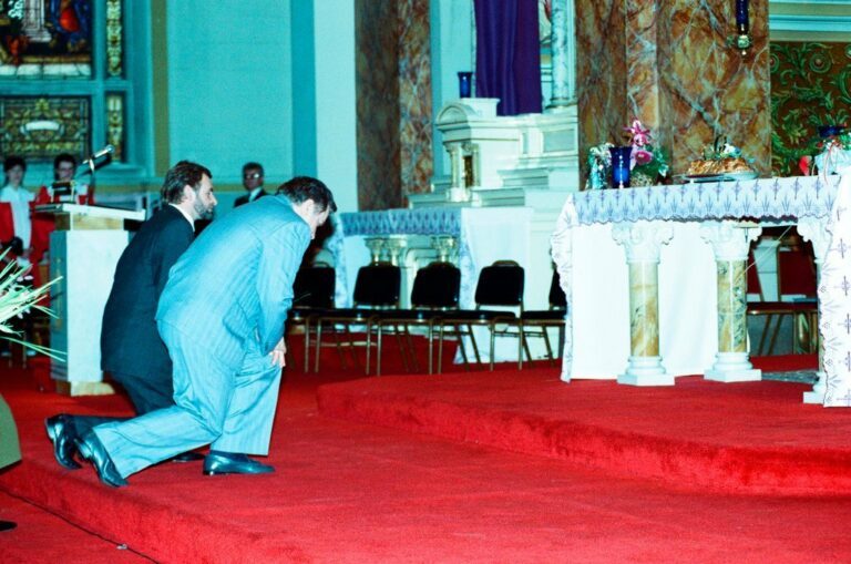 Lech Wałęsa (left foreground) genuflects during Palm Sunday Mass at St. Hyacinth Basilica, Chicago, March 24, 1991. ST-19041696-0158, Chicago Sun-Times collection, CHM