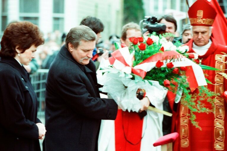After the service, Wałęsa and his wife, Danuta, placed a wreath before a monument outside the church commemorating Fr. Jerzy Popiełuszko, a priest in Poland who was supportive of Solidarity and murdered by agents of Poland’s Security Service of the Ministry of Internal Affairs. Rev. Popiełuszko was recognized as a martyr by the Catholic Church and exemplifies the role churches played in the resistance movement during the antireligious suppression of the Communist era.