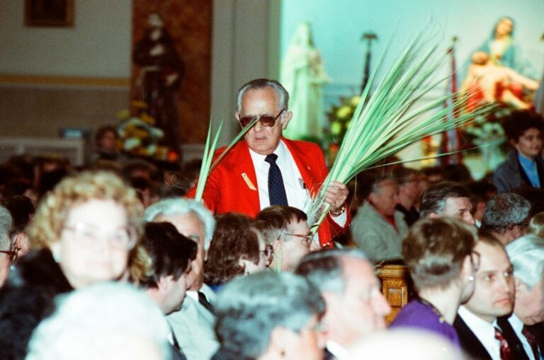 An usher distributes palm fronds at Palm Sunday Mass at St. Hyacinth Basilica, 3636 W. Wolfram St., Chicago, March 24, 1991. ST-19041696-0220, Chicago Sun-Times collection, CHM
