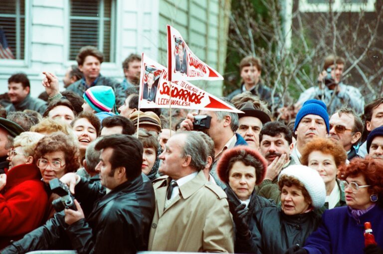 A crowd of people line the street to see Polish president Lech Wałęsa as he attends Palm Sunday Mass at St. Hyacinth Basilica, Chicago, March 24, 1991. Two people hold signs that welcome him and say “Solidarność,” which means “Solidarity” in Polish. ST-19041696-0190, Chicago Sun-Times collection, CHM