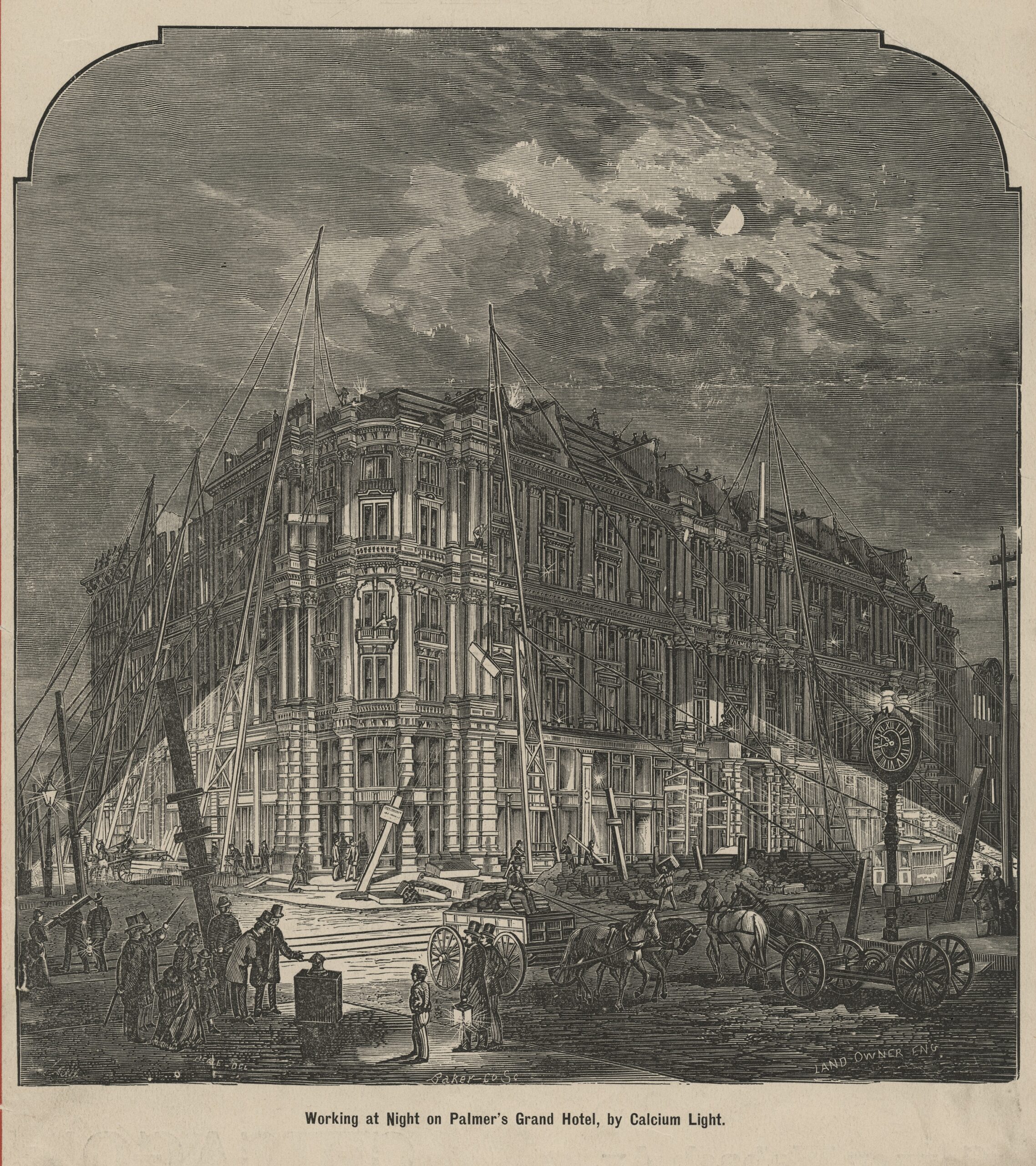 An engraving entitled “Working at Night on Palmer’s Grand Hotel, by Calcium Light,” 1871. CHM, ICHi-002930