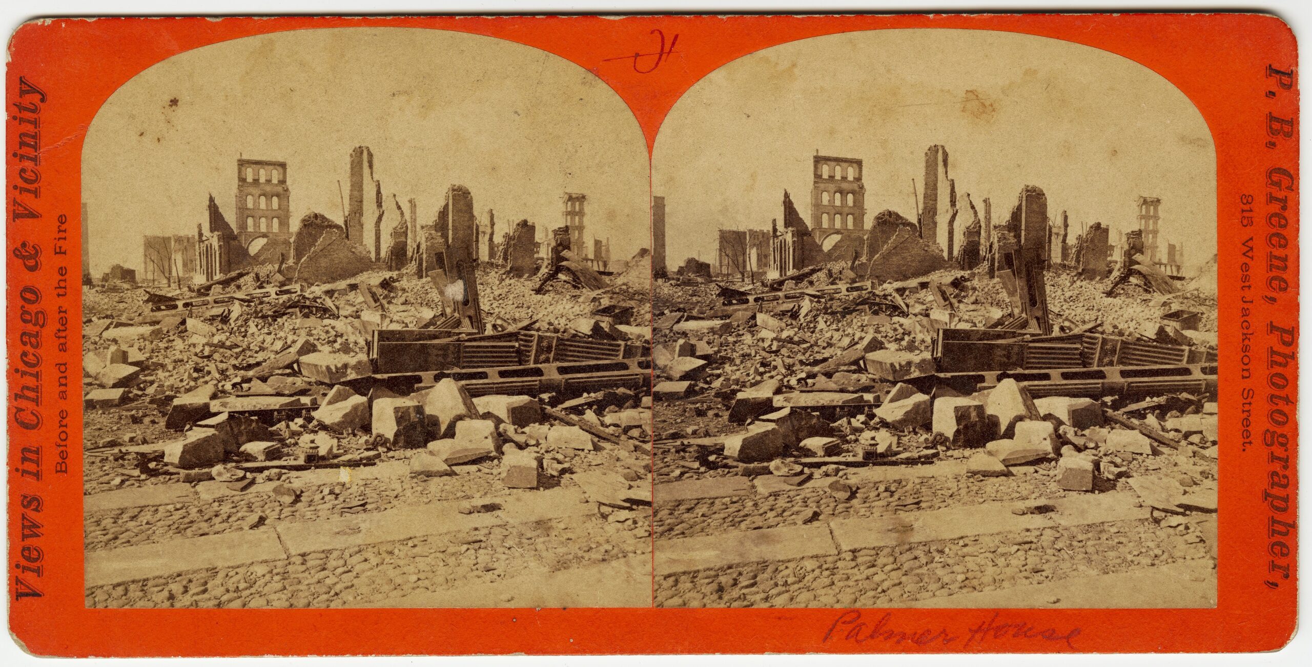 A stereograph of the Palmer House ruins after the Great Chicago Fire of 1871. CHM, ICHi-026749; P. B. Greene, photographer