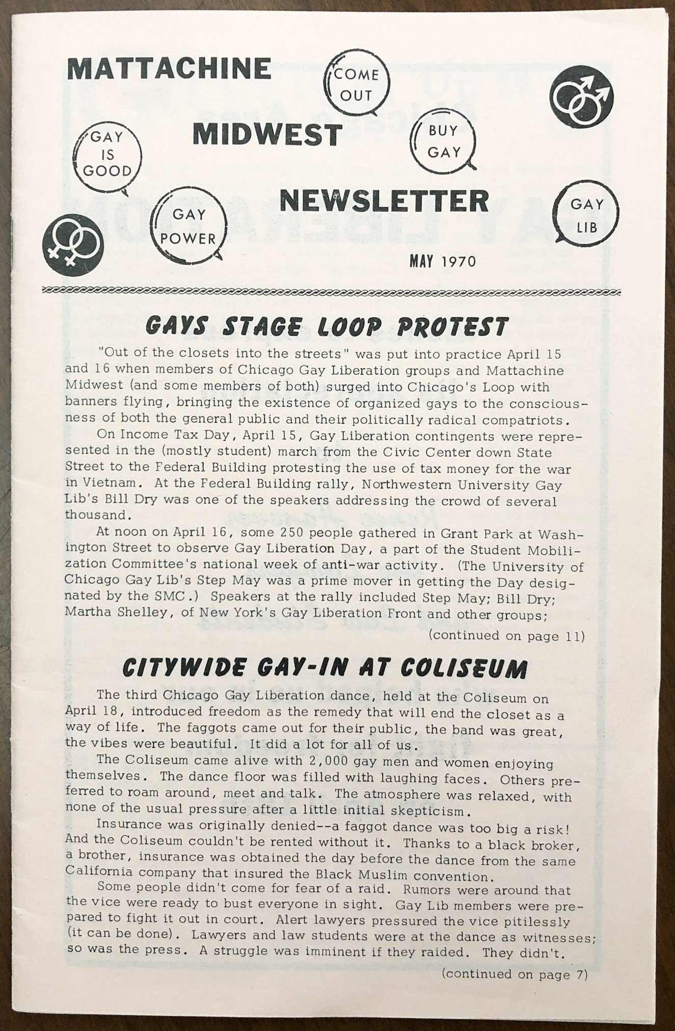 Cover of a Mattachine Midwest newsletter, May 1970. Pearl Hart papers, Box 10, folder 7