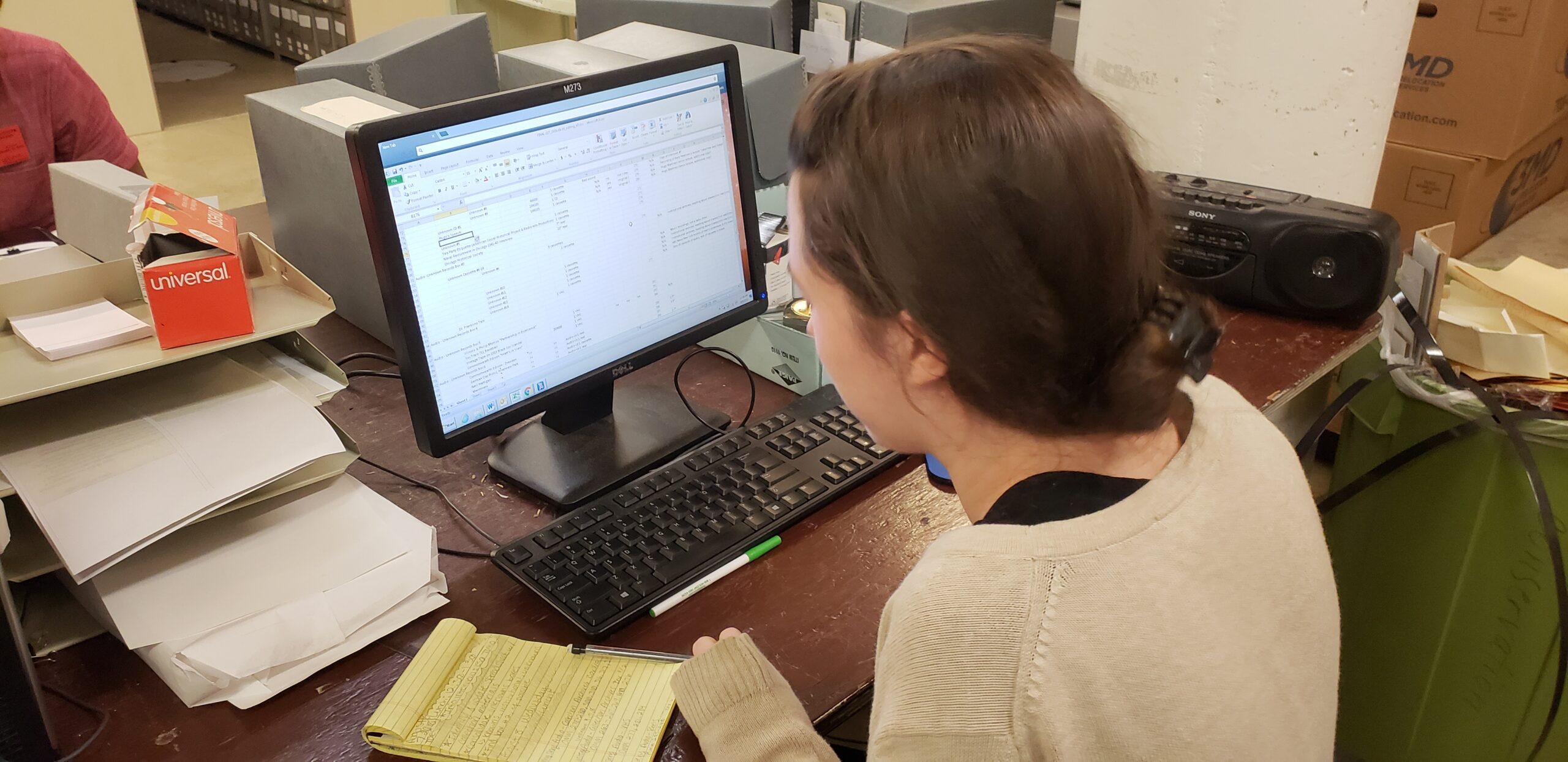 CHM collections intern Angela Thomas types her content notes after listening to cassette tapes.