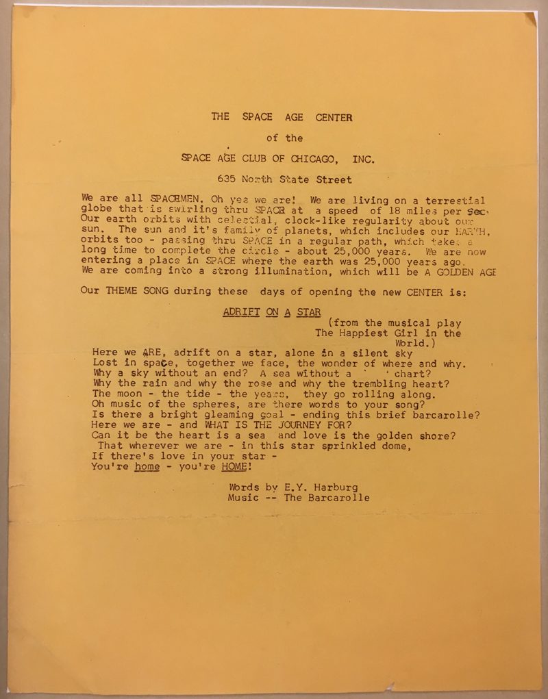 I have to admit, I did not know who Raymond Hudd was until I was processing his photograph collection for my archives practicum work at the Chicago History Museum. I was immediately taken by the photographs of his fanciful hats (some of which are in the Museum’s costume collection), his celebrity clients such as Phyllis Diller and Joan Crawford, and the poetry he wrote in conjunction with each hat design. But more so, I was fascinated by Hudd’s involvement with a mysterious group called the Space Age Club. I knew nothing about this group, and the photographs and printed material included in this collection did even less to explain Hudd’s exact relationship with it. After conducting some research, I found an article that explained Hudd had served as president of the Space Age Club of Chicago, which he founded in 1959.