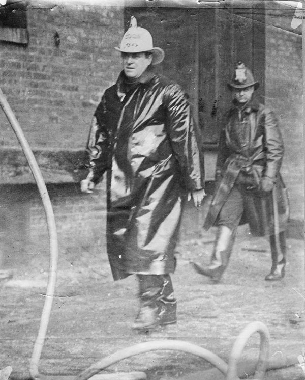 CFD chief Horan wears his helmet while at the scene of a fire, 1910. Photograph by the Chicago Daily News, CHM, DN-0008863