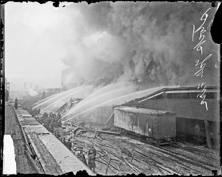A row of railcars separated the firemen from the burning building, hindering firefighting efforts. Photograph by the Chicago Daily News, CHM, DN-0056315
