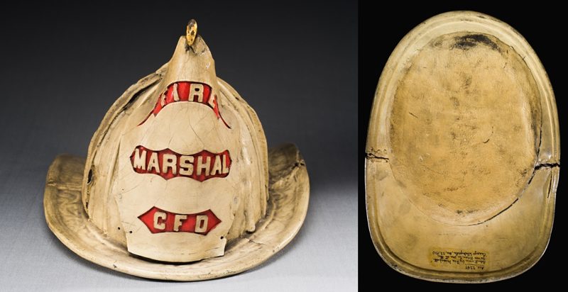 Horan’s fire marshal helmet, which was sealed at the bottom after his death. CHM, ICHi-168840 (left) and ICHi-168838