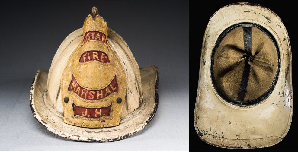 Horan’s widow donated the chief’s helmet to the Museum in 1947. A helmet from earlier in his career came from another donor in the 1930s. Together they remind us of those who died battling that long-ago fire.
