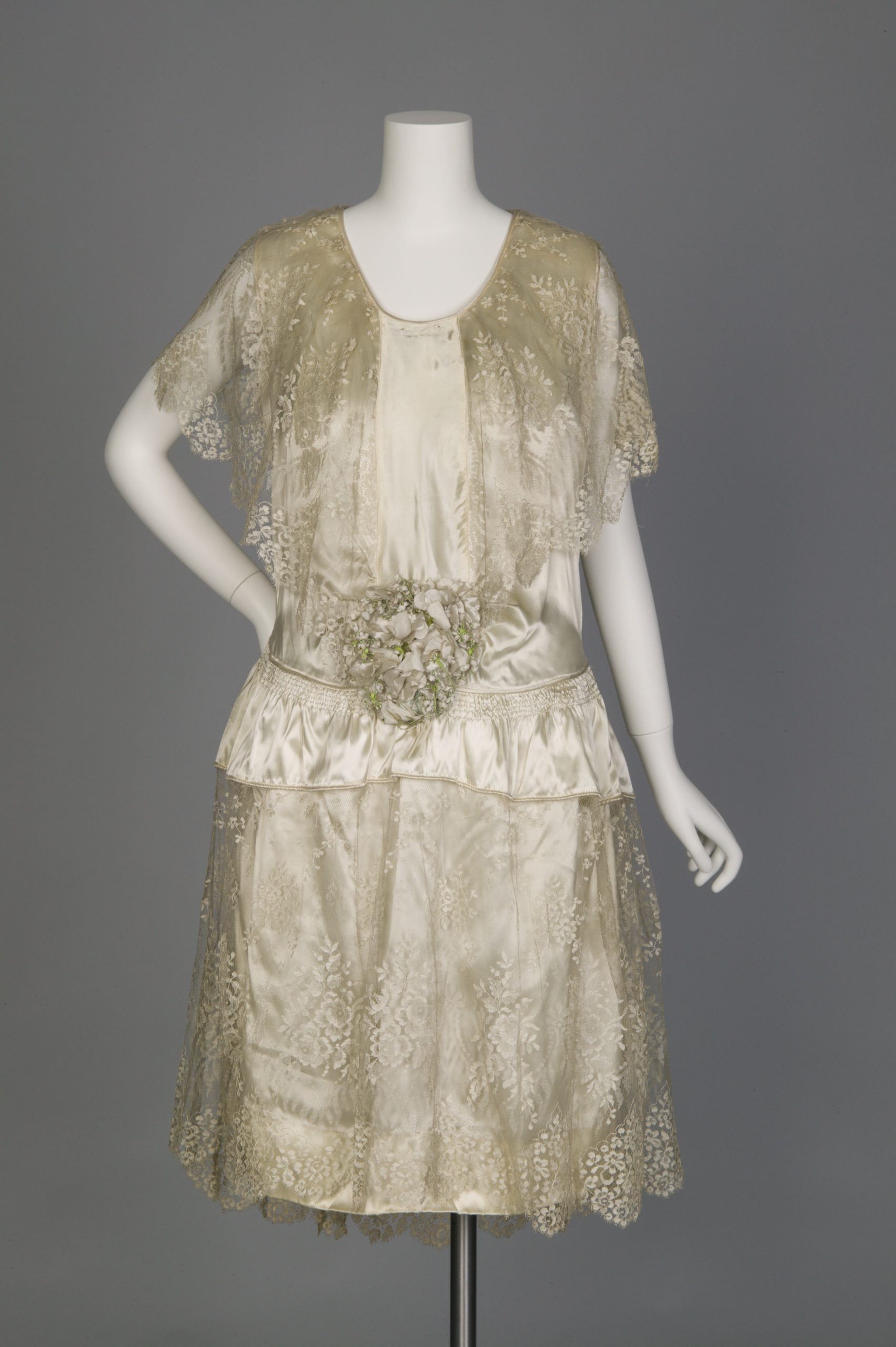 While this was worn as a wedding dress, it demonstrates 1930s style; silk satin and lace with silk flowers, 1930. CHM, ICHi-054652